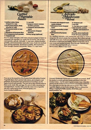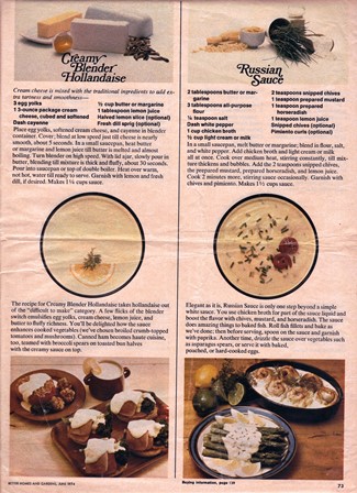 I really do not know any contemporary cooks, who make such sauces, but it might be fun to try an Avocado Mushroom Velvet, though canned mushrooms sound a bit soggy, for my taste, and Russian Sauce with pimento curls is not quite appetizing, but who knows.