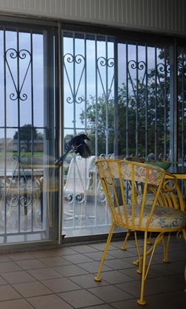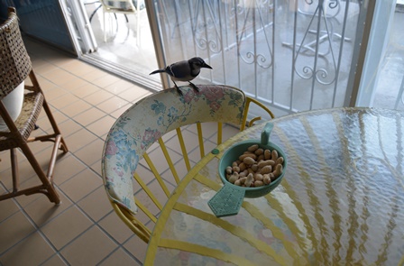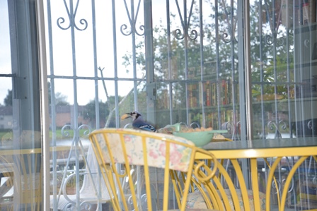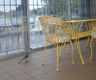 Sitting in the Florida room, on a rainy day, we opened a glass sliding door, to let the cool, fresh, air in, and much to our delight, the blue jay’s decided to come in for a quick bite to eat!