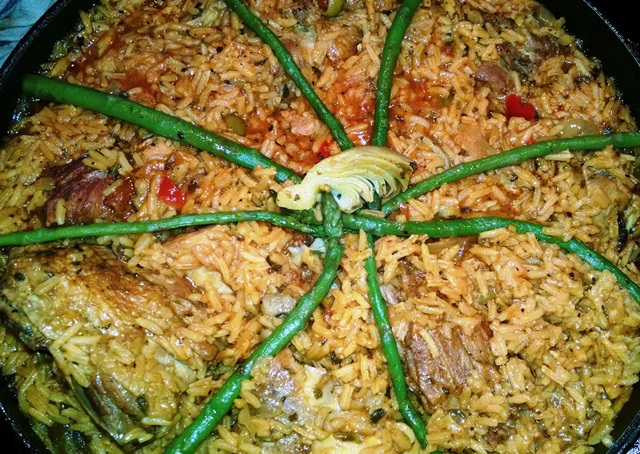 After about ten minutes, pour rice into a glass bowl, and approximately, 1 ½ cups of liquid per 1 cup of rice. For the liquid you may use a combination of water, stock, beer, and wine, or just water. Add 2-3 drops of yellow food coloring to the liquid, you want a nice amber color, not sunshine yellow, but rather something more mellow. Add rice and liquid to the chicken; bring to a boil, cover, and lower heat. Taste the stock to make sure it is sufficiently salted, and correct other flavors, as you go along. You want light, fluffy rice.