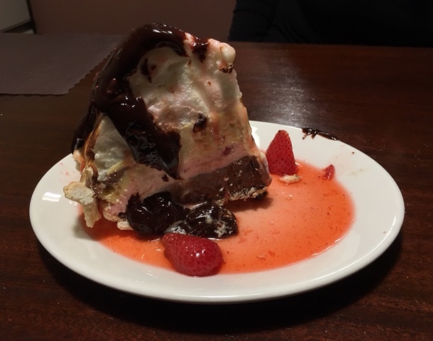 She said yes and it was a customer favorite; she went on to describe how she has watched it being made, and told us we could have it with either hot fudge sauce or strawberries. We asked if it was big enough for two, and she immediately said absolutely, no up selling. I told the waitress I had never had baked Alaska and had wanted to try it, Kate was equally enthusiastic, which both surprised and delighted me (see watching it made on television mattered), and I told our waitress to bring it with the hot fudge sauce, as I know Kate is not a huge fan of strawberries, and I was simply thrilled at the prospect of eating this fabled dessert. Kate however, quickly said no, you like strawberries, and the waitress said no problem, I will bring both, which she did!