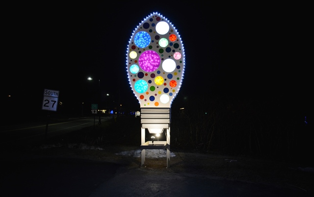 The colorful light bulb is on highway 27, used to advertise the color display at the Botanical Gardens in Boothbay, Maine.