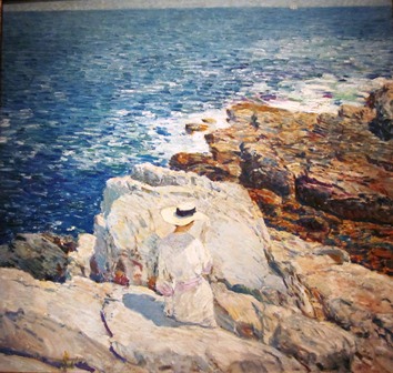 Have you ever wished you could be dropped into a painting? At the moment, I wish I were the woman in this painting, sitting on the rocks, starring out to sea, marveling at the beauty which God created. For those of you longing for brighter days, I offer: The South Ledges, Appledore, oil on canvas. It hangs at the Smithsonian, and captures Appledore Island, off the coast of Maine, where Hassam spent many a lovely summers surrounded by fellow artist, poets, and musicians, courtesy of Celia Thaxter.