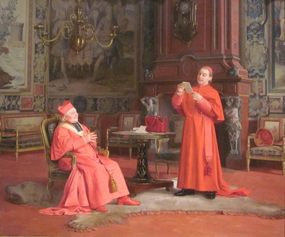 For the first time in six hundred years, the the College of Cardinals gather in Rome, to select the next Pope, without the loss of the previous head, of their church. While a solemn occasion, I think it may not be as somber, as it has been in the past. Thus I offer you a joyful look at an Emile Meyer painting, which I absolutely love. Painted at the end of the 19th century, this oil on panel is delightful; and the smile upon the seated Cardinals’ face, as he joyfully and attentively listens to The Letter makes me wish I too could hear what is being said.