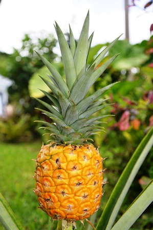 Like all bromeliad’s, pineapples can successfully be grown in containers, they do require bright light. If you would like to grow your own, simply cut the top off of a store bought pineapple, let it dry out for a few days, and then plant it in well-drained soil. It will not have an expansive root system, instead it feeds and waters itself through its leaves – if you are growing it as a house plant, at least once a week, water the rosette (the center of the top of the plant). Keep a little bit of water in the center, and your pineapple will happily grow.