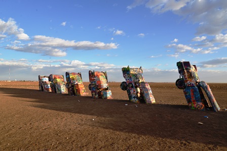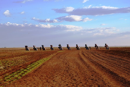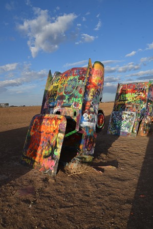 The half-buried cars, tailfin or lack thereof exposed, were originally planted by Chip Lord, Hudson Marquez and Doug Michels, as an outdoor art installation. Since then, they have been modified, mostly through spray paint, by the public – I would not say that the modifications have improved the view.