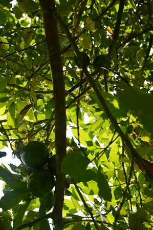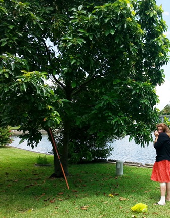 About ten days ago now, while in Florida, Kate ran into the house yelling for me to hurry, and follow her outside. She was smiling, sort of, I was wondering what had happened, but followed along. Finally, neither of us could handle the suspense and she yelled out: The tree is full of fruit!