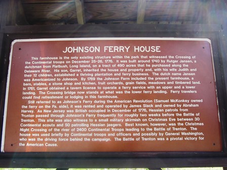 On the New Jersey side, you will also find: “The Johnson Ferry House, an 18th-century farmhouse and tavern near the Delaware River, was owned by Garret Johnson, who operated a 490-acre plantation and a ferry service across the Delaware. It was likely used by General Washington and other officers at the time of the Christmas night crossing of the Delaware. Several rooms are furnished with period pieces, and there is an 18th-century kitchen garden. On weekends, living history demonstrations are frequently held.” (Wikipedia).