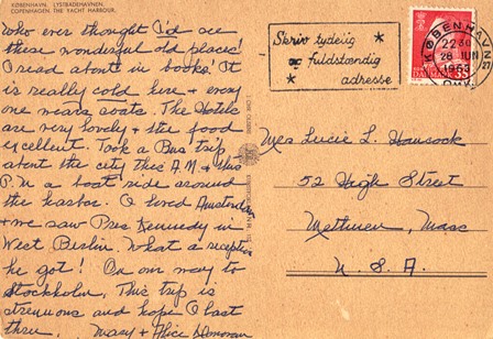 “Who ever thought I’d see these wonderful old places, I read about in books! It is really cold here & everyone wears coats. The hotels are very lovely & the food excellent. Took a bus trip about the city this A.M. & this P.M. a boat ride around the harbor. I love Amsterdam & we saw Pres. Kennedy in West Berlin. What a reception he got! On our way to Stockholm. This trip is tremendous and hope it last thru. Mary & Alice Donavan.”